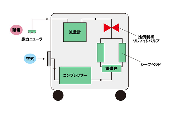 酸素濃縮器は周囲の空気から酸素を分離・濃縮して供給する装置で、医療現場や在宅療養で使用されます。温度や圧力変化にも影響を受けず、安定性して患者さんに酸素を供給することが求められます。タカノの流体制御製品は、外部の影響を受けず安定した流量と圧力の維持に貢献します。