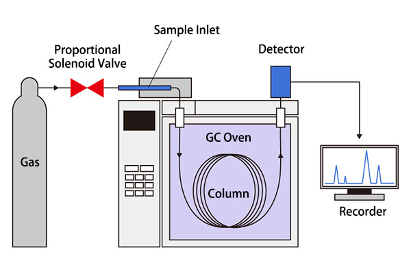 A gas chromatograph (GC) is an instrument that separates and analyzes components in a mixed gas. After the sample is gasified and separated by the column, the detector precisely measures the types and concentrations. In analyses involving trace amounts of samples, even slight fluctuations in flow rate can affect accuracy. Takano's fluid control products precisely regulate flow rates and provide a stable measuring environment. They are optimally suited for shut-off, switching, and flow rate adjustment in analytical instruments that demand high-precision measurements.