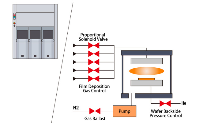 In semiconductor manufacturing equipment performing nanometer-scale fine processing, precise control of process parameters such as temperature, pressure, and gas concentration is indispensable. Proportional control solenoid valves can accurately adjust flow rates from small to large, contributing to precise process control and high-purity fluid control.