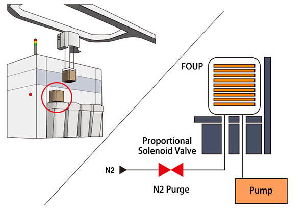 Semiconductor wafer handling systems are designed to safely transport wafers during the manufacturing process. They protect wafers from impurities and oxidation through nitrogen gas purging. Proportional control solenoid valves precisely control the flow rate and pressure of the purge gas, contributing to highly reliable wafer handling.